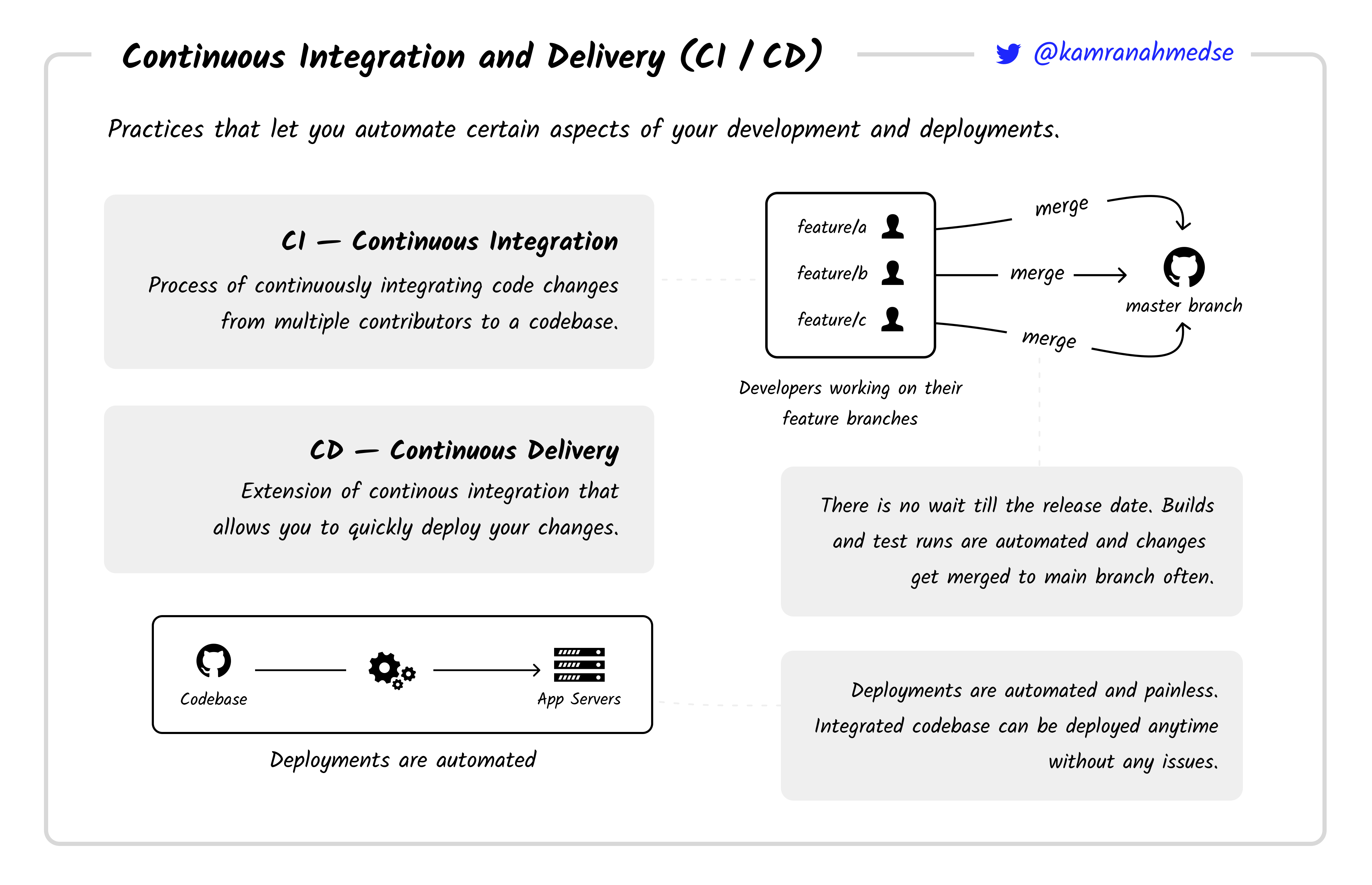The image below details the differences between the continuous integration and continuous delivery. Also, here is the accompanying video on implementing that with GitHub actions.